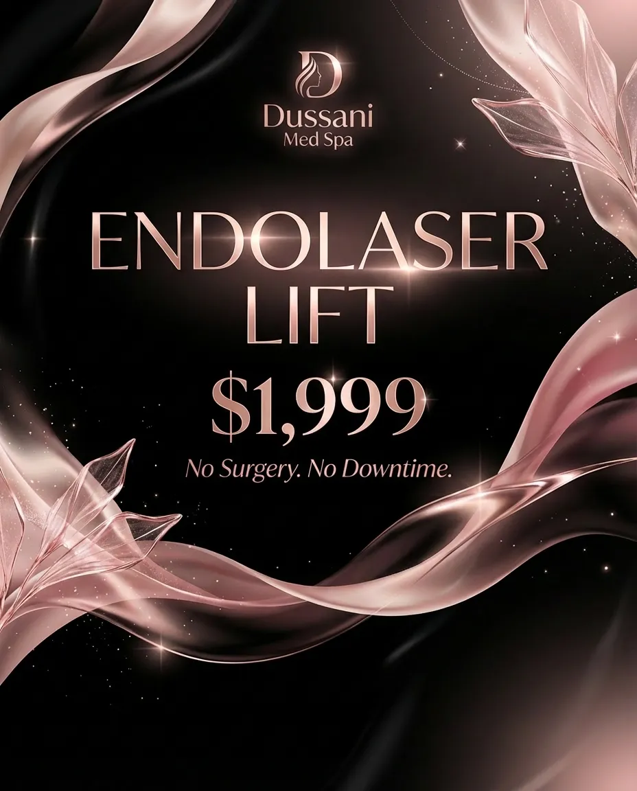 Rejuvenate your face without surgery or downtime with our exclusive Endolaser Full Face Transformation at Dussani Med Spa. This advanced, minimally invasive treatment combines endolifting laser, PDO threads, facial sculpting, lip filler, jawline contouring, non-surgical rhinoplasty, exosomes, Botox, and PRP to work on multiple layers of the face—tightening skin, reducing sagging, stimulating deep collagen production, enhancing facial definition, and restoring natural volume and harmony. The result is a firmer, more sculpted, and youthful appearance with natural-looking results and little to no recovery time. Limited-time special pricing available.